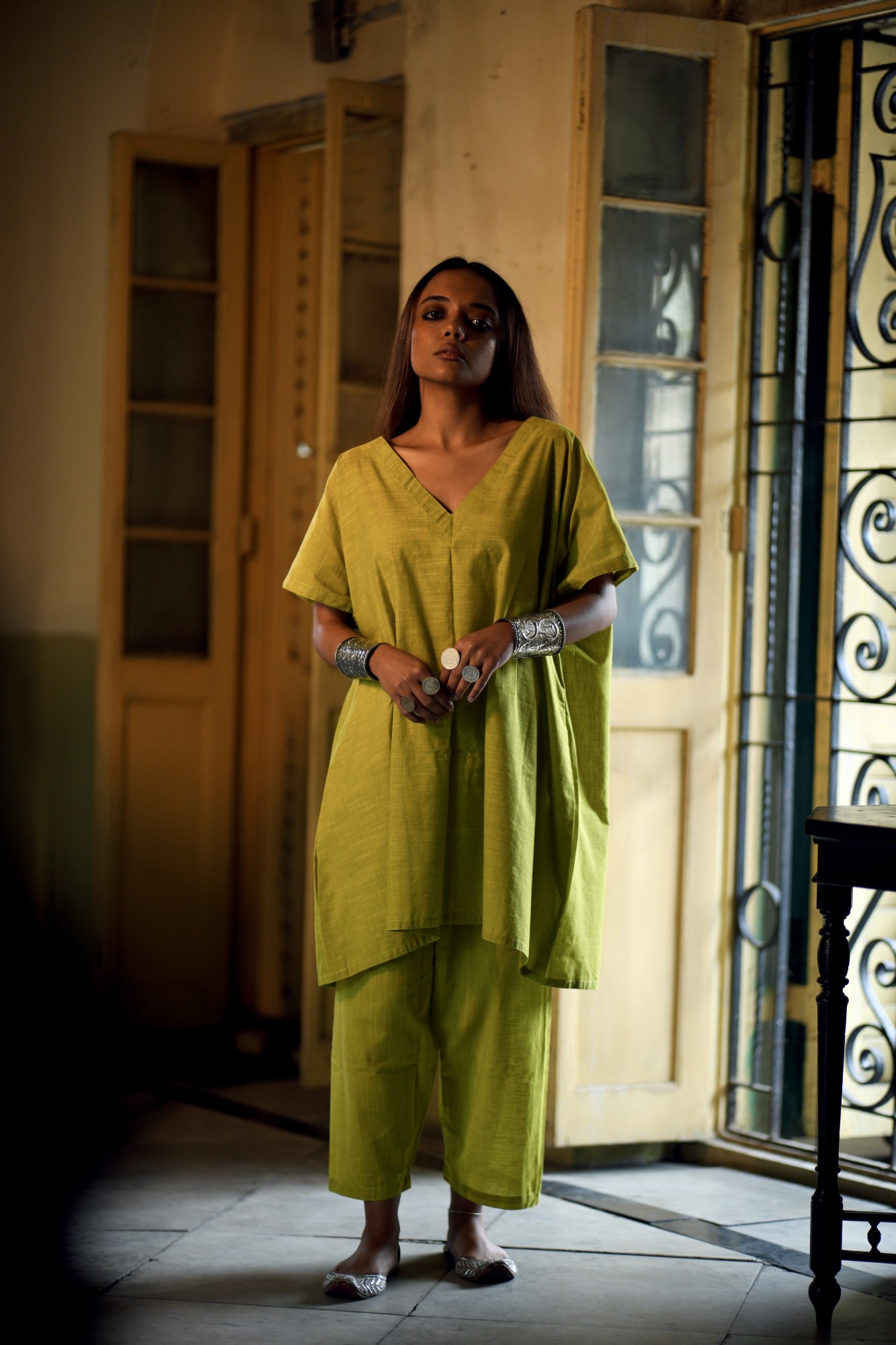 The olive easy set comes with a relaxed fit upper and a flared pant.
