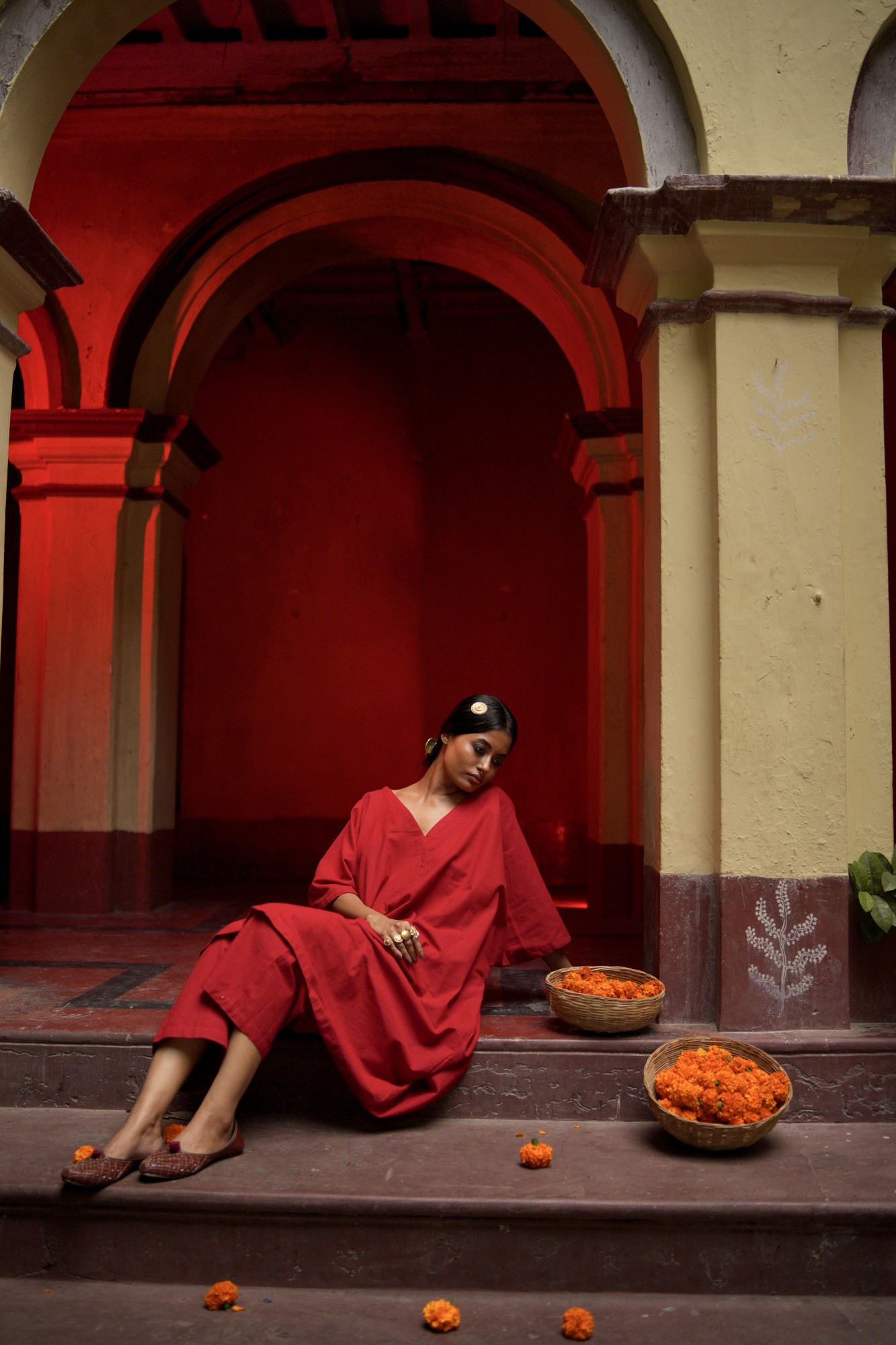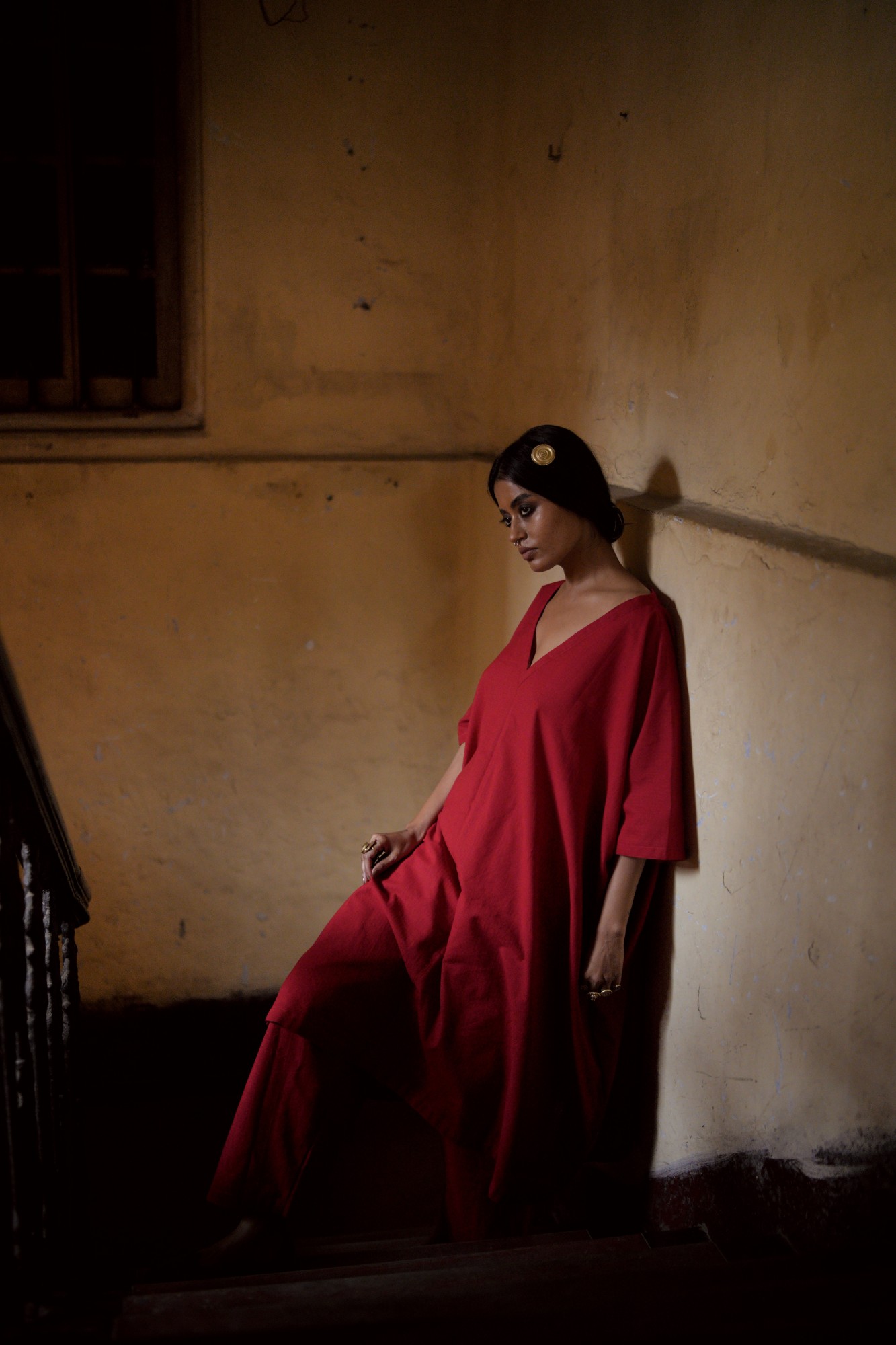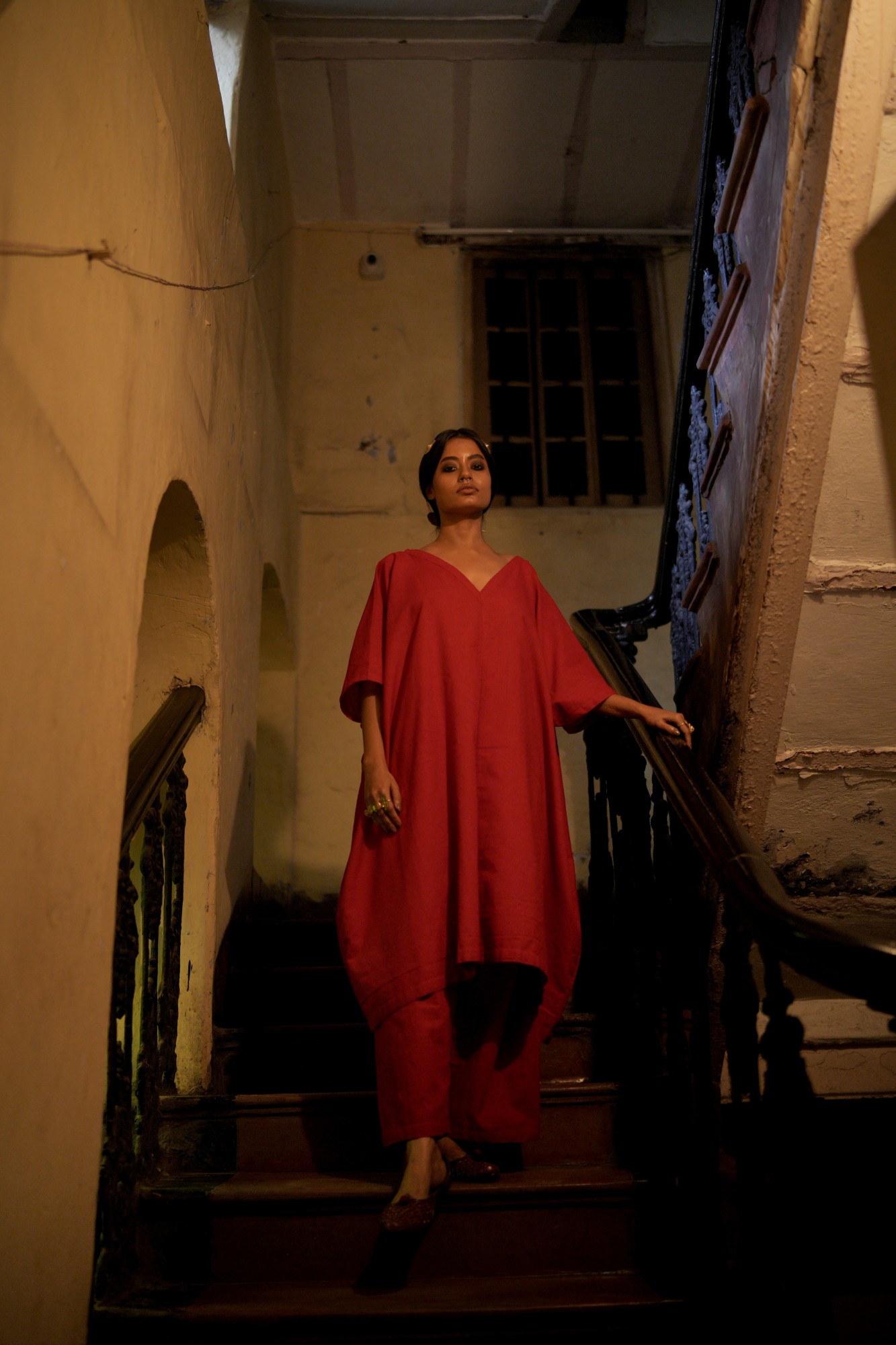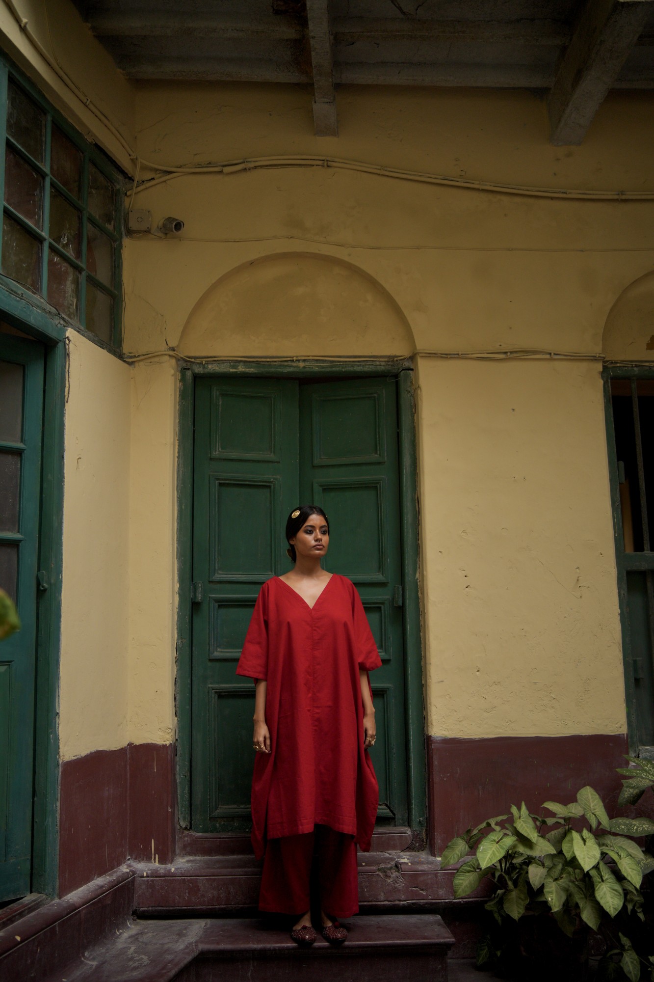 The red easy set comes with a relaxed fit upper and a flared pant.